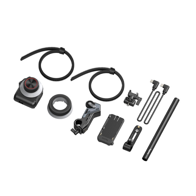 Follow Focus: 1 Follow inalámbrico SmallRig MagicFiz, 1 Motor de follow con mariposa, 1 Placa base para batería NP-F550, 1 Rod de 15 cm, 1 Grip con mariposa y pin de bloqueo, 2 Baterías NP-F550, 1 Cargador de baterías NP-F970 con cable y cabeza AC, 1 Anillo adaptador para lentes no dentados, 1 Cable USB-C a USB-C para conexión a cámara, 1 Divisor de maleta cuadrado, 1 Maletín.