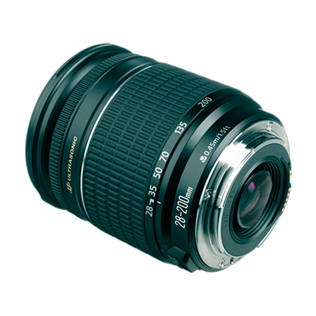 Óptica: 1 Lente Canon 28–200mm f/3.5–5.6 (montura Canon EF), 2 Tapas de lente, 1 Estuche para lente.